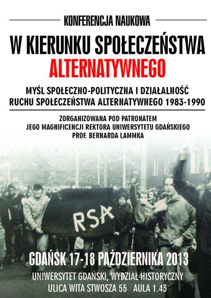 W ramach Centralnego Projektu Badawczego Opozycja w Polsce 1976–1989. Encyklopedia Solidarności Europejskie Centrum Solidarności , Oddziałowe Biuro Edukacji Publicznej IPN w Poznaniu i Gdańsku, Parlament Studentów Uniwersytetu Gdańskiego, Rada Doktorantów Uniwersytetu Gdańskiego, Region Gdański NSZZ „Solidarność” oraz Wydział Historyczny Uniwersytetu Gdańskiego zapraszają w dniach 17–18 października 2013 r. do udziału w konferencji naukowej „W kierunku społeczeństwa alternatywnego. Myśl społeczno-polityczna i działalność Ruchu Społeczeństwa Alternatywnego 1983–1990″. Patronat nad konferencją sprawuje Jego Magnificencja Rektor Uniwersytetu Gdańskiego Prof. Bernard Lammek.