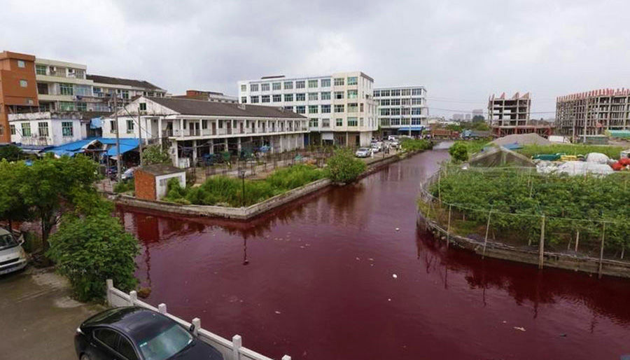 Rzeka w mieście Xinmeizhou w Prowincji Zhejiang zmieniła kolor na czerwony. Do wszystkiego doszło w czwartek rano, kiedy mieszkańcy jadący do pracy przecierali oczy ze zdumienia. Wody rzeki na wielokilometrowym odcinku przybrały kolor krwi.
