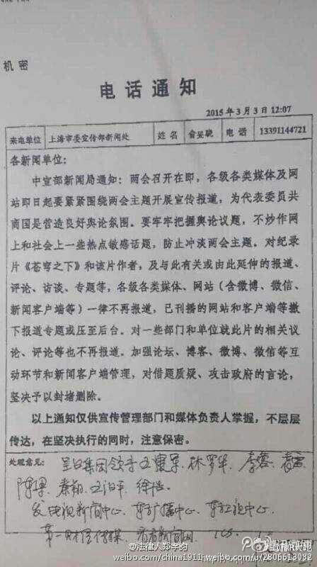 „Do wszystkich jednostek roboczych: Biuro Informacji Centralnego Departamentu Propagandy przekazał następującą zawiadomienia: Dwie Sesje* maja się zacząć. Media i strony internetowe na wszystkich poziomach muszą w nadchodzących dniach skoncentrować zainteresowanie na głównym rozwoju wypadków na Dwóch Sesjach w celu stworzenia przyjaznej atmosfery opinii publicznej dla rozmów reprezentantów i członków komitetu na temat spraw narodowych. Aby uniknąć osłabienia tematów Dwóch Sesji, musicie utrzymać ścisłą kontrolę dyskursu publicznego i unikać sensacyjności pewnych wrażliwych tematów pochodzących z Internetu i społeczeństwa. Media i strony internetowe wszystkich typów i poziomów (włącznie z Weibo, WeChat i portalami informacyjnymi) muszą absolutnie przerwać doniesienia [na temat] dokumentu „Pod Kopułą”** i jego twórczyni, jak i reportaży, komentarzy, wywiadów i tematów specjalnych, które dotyczą lub rozwijają [temat] tego filmu i jego twórczyni. Strony internetowe i serwisy, które już zawierają takie treści muszą usunąć specjalne wyróżnienia lub przesunąć je na koniec. Nie kontynuować reportaży na temat dyskusji odnoszących się do pewnych departamentów i jednostek roboczych związanych z tym filmem. Zwiększyć zarządzanie forami, blogami, Wiebo, WeChat i innymi interaktywnymi platformami, i stanowczo blokować oraz usuwać wystąpienia, które używają tego jako okazji aby wzbudzać wątpliwości lub atakować rząd.