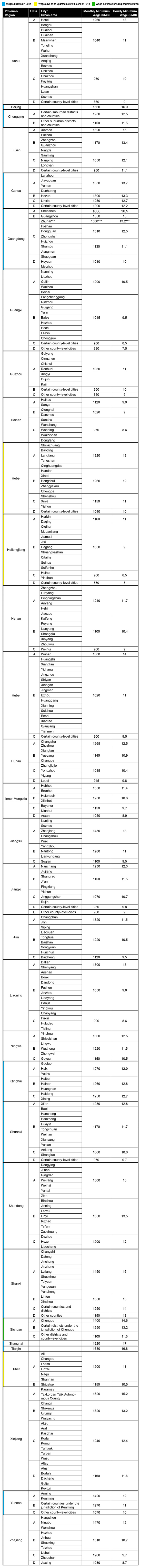 Poszczególne regiony administracyjne prowincji przynależą do rożnych klas, w których są ustanowione różne płace minimalne (miesięczne i stawki godzinowe). Od najwyższej w klasie A do najniższej w klasie C, D lub E (nie wszystkie prowincje mają aż pięć klas). Miasta wydzielone (Pekin, Szanghaj, Tianjin i Chongqing) należą w całości do jednej klasy.