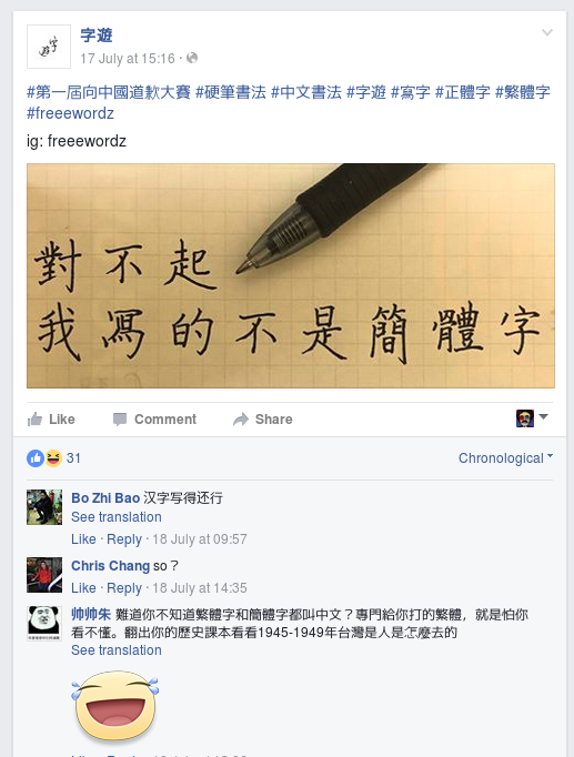 Moje ulubione przeprosiny (na zdjęciu powyżej) pochodzą od użytkownika 字遊 (zi you), co oznacza „podróżujący hieroglif”, ale jest też homofonem dla słowa „wolność” (自由). #freewordz przeprasza, że nie zna uproszczonych znaków, jakimi się posługuje kontynent.