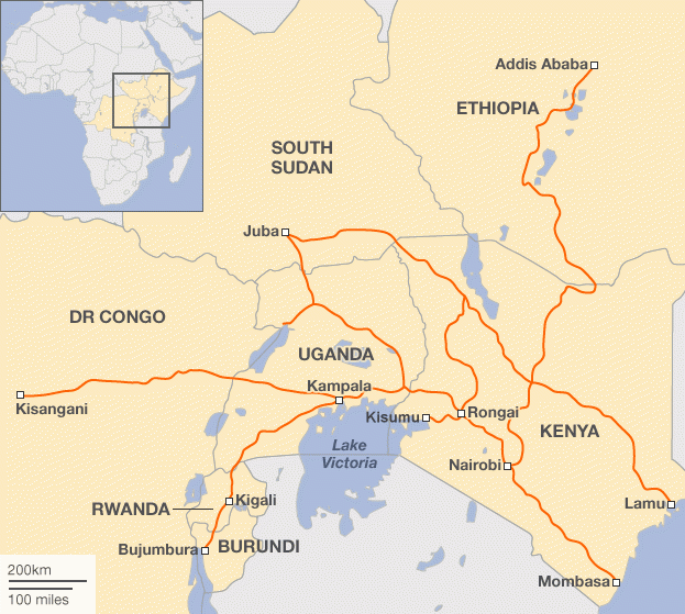 Tzw. Nowe Koleje Wschodnioafrykańskie połączą w zintegrowaną siecią kolejową nie tylko Kenię, Etiopię, Południowy Sudan, Demokratyczną Republikę Kongo, Ugandę, Rwandę i Burundi, ale przez Tanzanię sięgną dalej na południe do Zambii, Mozambiku i Botswany. Wszystkie nitki będą prowadzić do Mombasy, a stamtąd na Daleki Wschód, do ChRL.