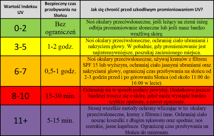 Według skali promieniowania UV przy 11 punktach lub więcej przebywanie 15 minut na słońcu grozi poparzeniami, jednak także przy 8-10 punktach jest to niewiele więcej, ponieważ ledwie 20 minut jest już niebezpieczne. Najlepiej w ogóle unikać słońca między 10 a 14.