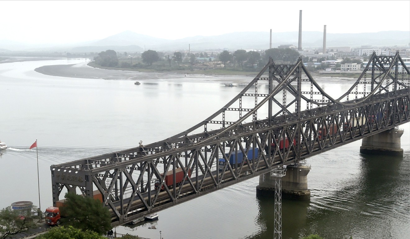 Most w Dandong, na granicy Korei Północnej i ChRL. Ciężarówki, jak jechały sznurem, tak nadal jadą mimo oficjalnemu ogłoszeniu sankcji przez ChRL (zdjęcie: Kyodo).