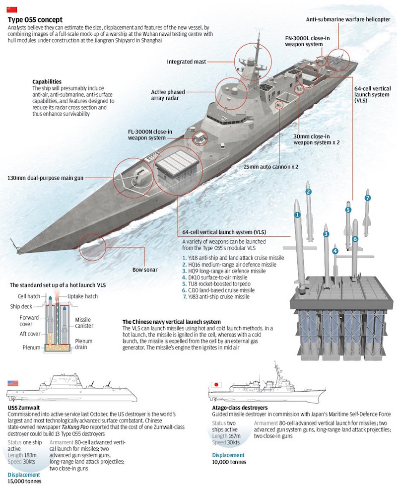 Typ 055 to nowoczesny 180 metrowy niszczyciel, wyporności 13 tysięcy ton,1 z kadłubem pochłaniającym fale radarowe. Jest wyposażony w 112 miejsca startowe dla rożnego typu pocisków samosterujących, sprzęt do walki elektronicznej, helikopter do zwalczania okrętów podwodnych, a rządowe media sugerują, że w przyszłości będzie na nich montowane działo elektromagnetyczne. Co ciekawe, Marynarka ALW klasyfikuje Typ 055 jako niszczyciel, mimo że jego rozmiary są większe od amerykańskich krążowników typu Ticonderoga (w służbie US Navy są 22 jednostki), które mogą być potencjalnymi przeciwnikami Typ 055.