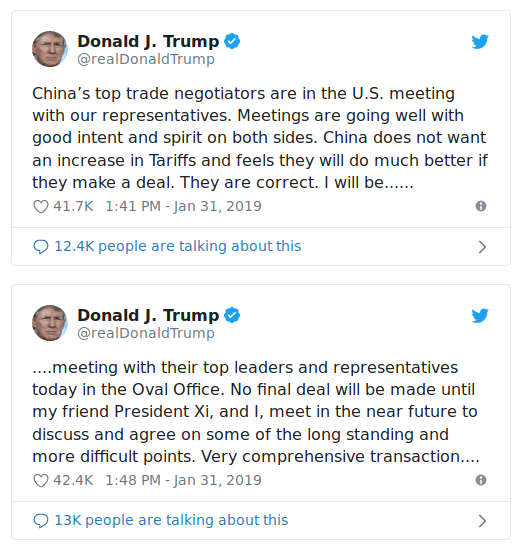 Kontrolowane przecieki z obydwu stron wskazują, że rozmowy przebiegają w dobrej atmosferze oraz iż dokonano sporego postępu. Na to, że „super deal“ jest w zasięgu wzroku dowodzi także fakt, że zaczęto mówić o organizacji szczytu Donalda Trumpa z Xi Jinping, który miałby miejsce pomiędzy drugim spotkaniem Trumpa z Kim Dzong Un, a drugim marca, kiedy wygasa „zawieszeni broni“ w wojnie handlowej.