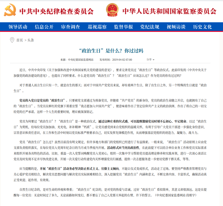 W ogólniku można przeczytać, iż kiedy „zwykli ludzie mają tylko jedne urodziny”, to „dla członków partii komunistycznej są dwie [takie daty]”. „W dodatku do dnia, kiedy się urodzili, innym specjalnym dniem są «polityczne urodziny»”. „Urodziny służą przypomnieniu wartości i szacunku dla życia. «Polityczne urodziny» mają przypominać o miłości i oddaniu partii.”
