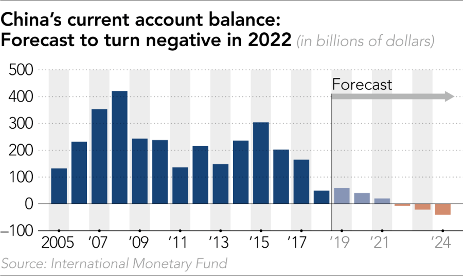 Międzynarodowy Fundusz Walutowy (International Monetary Fund, IMF) przewiduje, że rachunek bieżący bilansu płatniczego ChRL od 2022 roku znajdzie się i pozostanie w przewidywalnej przyszłości na pozycjach ujemnych, ok. minus 6,6 miliarda USD. Jednak już w tym roku zbliżył się praktycznie do zera. Ma w tym procesie swój udział wojna handlowa ze Stanami Zjednoczonymi, ale jest to w najlepszym wypadku akcelerator, a nie przyczyna całego procesu.