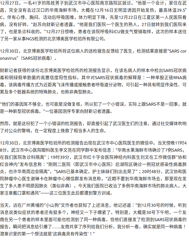 Dzisiaj zamiast wpisu zrzuty ekranu oryginalnego artykułu z Caixin 新冠病毒基因测序溯源:警报是何时拉响的 (Nowe ślady sekwencjonowania genów koronawirusa: po uruchomieniu alarmu), o którym pisałem wczoraj – kopia jest jeszcze dostępna tutaj.