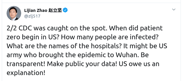Nic dziwnego, że Pekin od jakiegoś czasu próbuje przykryć swoje błędy narracją, że COVID-19 został stworzony i wypuszczony w Chinach przez Amerykanów. Rzecznik MSZ w Pekinie, Zhao Lijian zasugerował to wprost na swoim koncie na Twitterze (SIC!).