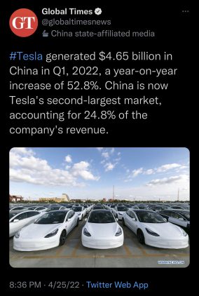 Co ciekawe, wydaje się, że w w Pekinie też są ludzie, którzy tak myślą. „Global Times”, tabloid należący do „Dziennika Ludowego” organu KC KPCh, w swoim wpisie (już usuniętym) na Twitterze, przygotował w poniedziałek, kiedy Musk dostał zgodę rady nadzorczej Twittera na przejęcie, krótkie zestawienie inwestycji Tesli w ChRL.