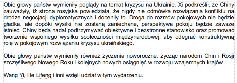 I co nadal są tacy, co uważają, że Xi Jinping czy ChRL dystansują się od Rosji i Putina? Lektura chińskiego komunikatu po spotkaniu powinna zadziałać jak wiadro zimnej wody. Jednak mam wrażenie, że to jest czasami kwestia wiary, więc jeżeli fakty nie zgadzają się z faktami, tym gorzej dla faktów.