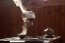 W odpowiednim makijażu na twarzy schodzi z piętra,
