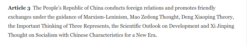 Nowe prawo czyni formalnie kierownictwo partii a nie Centralny Rząd Ludowy odpowiedzialne za kierowanie polityką zagraniczną, chociaż mówi tylko o „centralnym ciele przewodnim dla polityki zagranicznej,” ale to po prostu odpowiednia komisja KC KPCh.