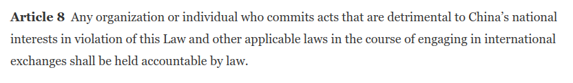Moim zdaniem interesujący zapis to artykuł 8, w którym nowa ustawa wymaga, aby wszystkie organizacje i osoby prywatne stały na straży chińskich korzyści w wymianie międzynarodowej, a każdy, kto „popełnia czyny szkodliwe dla narodowych interesów Chin”, zostanie pociągnięty do odpowiedzialności.