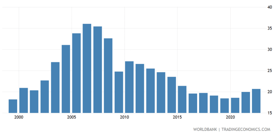 Po pierwsze, przez dekady przynajmniej połowa PKB to były inwestycje infrastrukturalne, które rzadko kiedy przekładały się na realną gospodarkę, a już na pewno nie po 2008 roku. To oznacza, że jeżeli za realną gospodarkę możemy wziąć połowę PKB, to udział eksportu w tej części PKB wynosi nie 20,68% (2022), ale 41,32%.