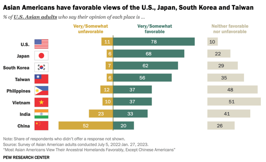 Pew Research Centre opublikował wyniki bardzo insertującego badania dotyczącego postrzegania kraju pochodzenia przez Amerykanów Azjatyckiego pochodzenia. Kiedy większość z nich postrzega kraj przodków pozytywnie, to Amerykanie chińskiego pochodzenia mają bardziej mieszane poglądy na temat Chin. Mniej niż połowa twierdzi, że ma przychylną opinię, chociaż wciąż większy odsetek Amerykanów pochodzenia chińskiego (41%) ma pozytywną opinię o Chinach niż inni Amerykanie azjatyckiego pochodzenia (14%) – średnia dla całej grupy Amerykanów azjatyckiego pochodzenia to 20%.