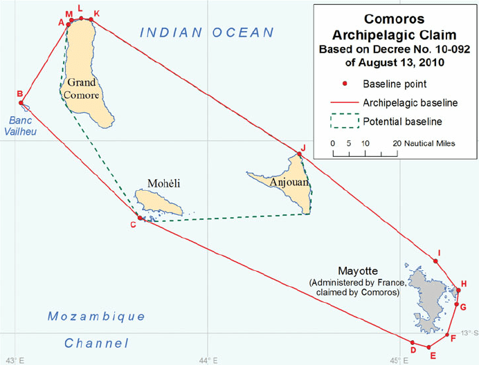 Oczywiście, samo powstanie takiej wysepki nie powiększa terytorium Japonii jako takiego, ale ponieważ znajduje się ona blisko Iwo Jimy, więc – jeżeli wysepka przetrwa – wpłynie na przebieg japońskiego morza terytorialnego w tym regionie. Sama wysepka nie jest z definicji wyspą w sensie prawnomiędzynarodowym, więc nie może stanowić podstawy do roszczeń do wyznaczenia morza terytorialnego itd. Jednak, jeżeli może być włączona do do linii podstawowej wybrzeża, to w takim wypadku (i tylko takim) wpływa na zasięg morza terytorialnego, które jest liczone 12 mil morskich od linii podstawowej wybrzeża. Widać to na przykładzie roszczeń Komorów do włączenia wysepki Banc Vailheu (punkt B) w obręb podstawowej linii wybrzeża. Moim zdaniem mocno naginane w przeciwieństwie do skał na południe o wyspy Mohéli (punkt C).