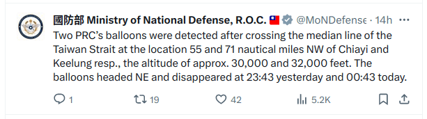 Ministerstwo obrony Tajwanu poinformowało wczoraj, że „dwa balony ChRL zostały wykryte po przekroczeniu linii mediany Cieśniny Tajwańskiej w miejscu odpowiednio 55 i 71 mil morskich na północny zachód od Chiayi i Keelung, na wysokości około 30 tys i 32 tys stóp. Balony skierowały się na północny -wschód i zniknęły o 23:43 wczoraj i 00:43 dzisiaj.” Mimo, że jeszcze w czerwcu ubiegłego roku zapowiadano, że takie balony będą zestrzeliwano, to nie podjęto żadnych działań.