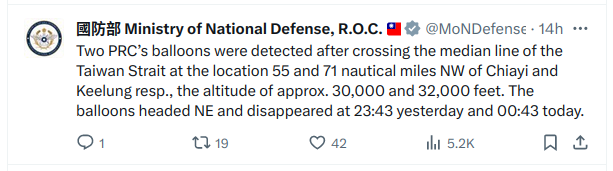 Ministerstwo obrony Tajwanu poinformowało wczoraj, że „dwa balony ChRL zostały wykryte po przekroczeniu linii mediany Cieśniny Tajwańskiej w miejscu odpowiednio 55 i 71 mil morskich na północny zachód od Chiayi i Keelung, na wysokości około 30 tys i 32 tys stóp. Balony skierowały się na północny -wschód i zniknęły o 23:43 wczoraj i 00:43 dzisiaj.” Mimo, że jeszcze w czerwcu ubiegłego roku zapowiadano, że takie balony będą zestrzeliwano, to nie podjęto żadnych działań.