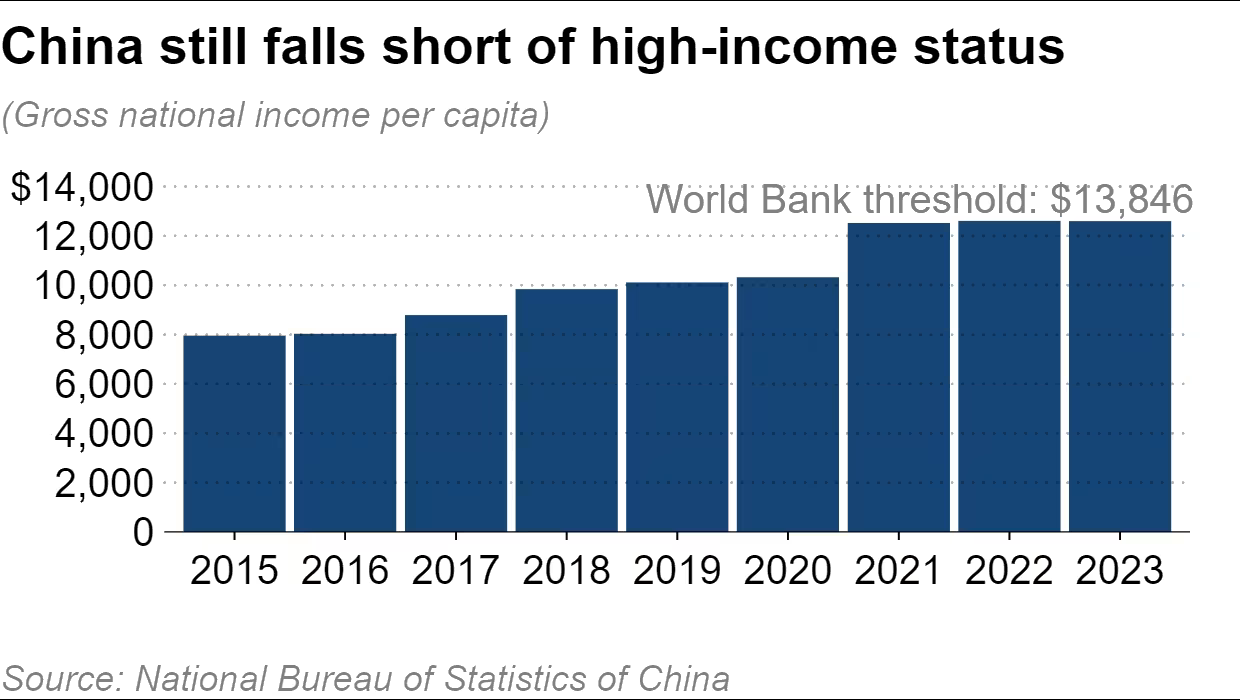 Takie wyniki oddalają ChRL od statusu państwa o wysokich dochodach. Ostatnia coroczna rewizja klasyfikacji dochodów, przeprowadzona w lipcu przez Bank Światowy, podniosła minimalny dochód narodowy brutto (DNB) na mieszkańca dla kategorii o wysokich dochodach o 5% do 13 846 USD. Chiński DNB per capita był o 9% niższy od tego poziomu, po tym jak w 2021 roku zmniejszył lukę tylko do około 1%.