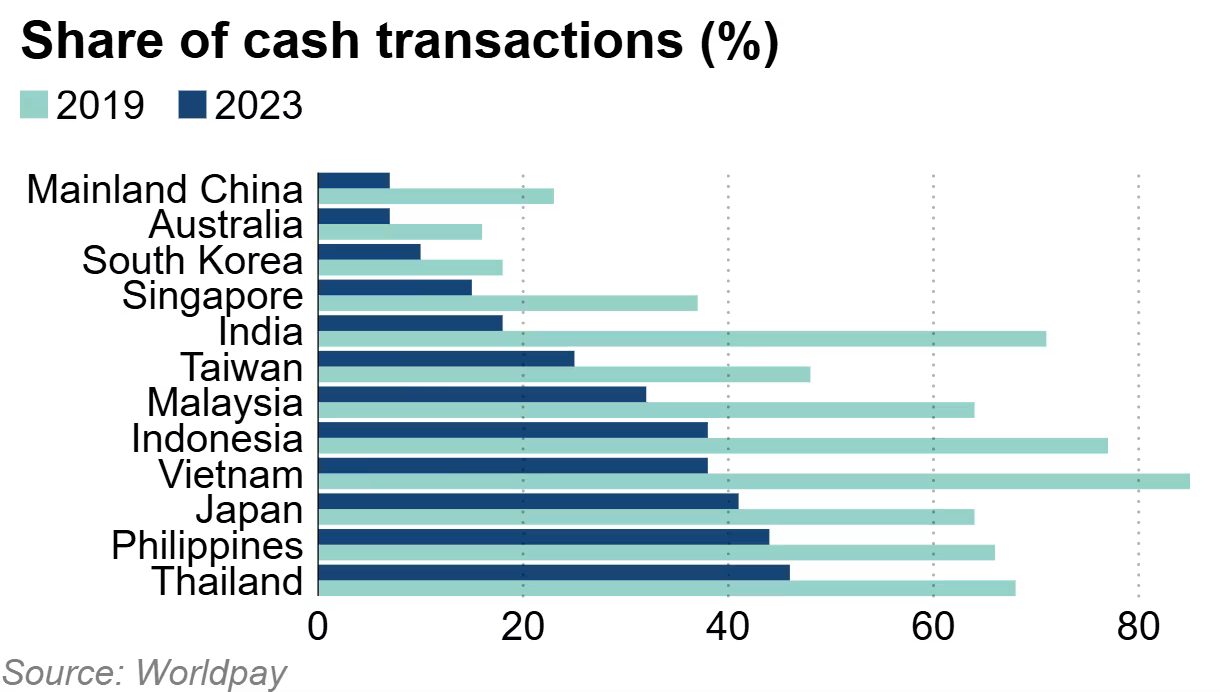 Generalnie gotówka szybko zanika w transakcjach konsumenckich w całej Azji, zastępowana przez kody QR i inne technologie oparte na smartfonach. Według prognoz Worldpay, amerykańskiej firmy zajmującej się przetwarzaniem płatności, do 2027 roku fizyczne pieniądze będą stanowić zaledwie 14% wszystkich transakcji, w porównaniu z około 47% w 2019 roku.