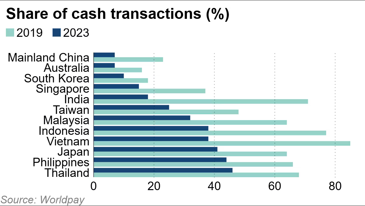 Generalnie gotówka szybko zanika w transakcjach konsumenckich w całej Azji, zastępowana przez kody QR i inne technologie oparte na smartfonach. Według prognoz Worldpay, amerykańskiej firmy zajmującej się przetwarzaniem płatności, do 2027 roku fizyczne pieniądze będą stanowić zaledwie 14% wszystkich transakcji, w porównaniu z około 47% w 2019 roku.