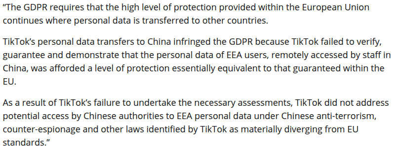 W wyniku niepodjęcia przez TikTok niezbędnych ocen, TikTok nie zajął się potencjalnym dostępem chińskich władz do danych osobowych EOG na mocy chińskich przepisów antyterrorystycznych, kontrwywiadowczych i innych przepisów zidentyfikowanych przez TikTok jako istotnie odbiegające od standardów UE.