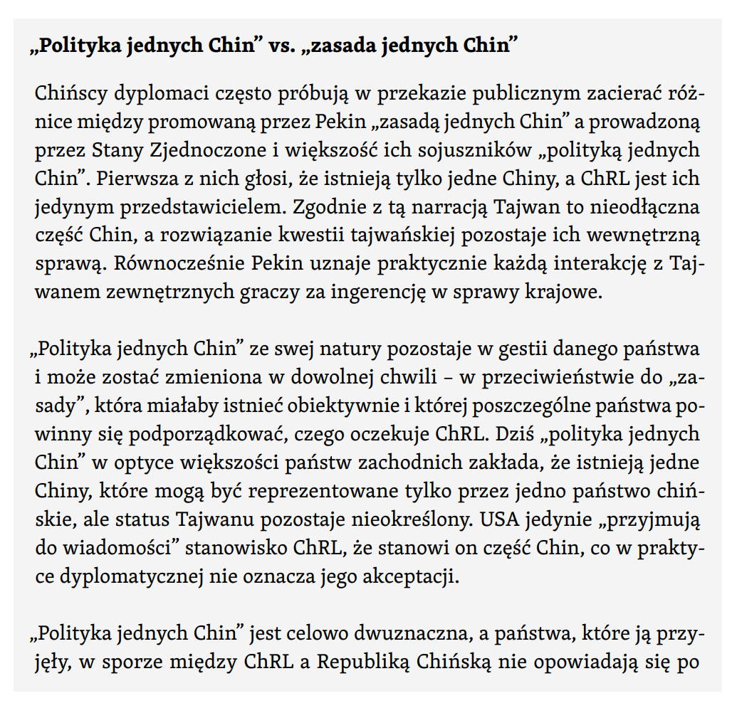 Zaraz będziemy mieli w mediach korowód „ekspertów” tłumaczących, jak to Takechi musiała się cofnąć. W rzeczywistości nic się nie zmieniło w stanowisku Tokio. Wyjaśniałem już kilka razy różnice między „polityką jednych Chin” a „zasadą jednych Chin”, ale nie zaszkodzi powtórzyć jeszcze raz dla opornych intelektualnie.
