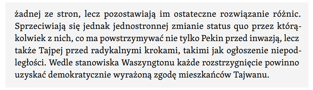 „Podstawowe stanowisko rządu japońskiego w sprawie Tajwanu pozostaje takie samo, jak określono w wspólnym komunikacie japońsko-chińskim z 1972 r oku i nie uległo ono żadnej zmianie” – powiedziała Takaichi. Zgodnie z komunikatem „rząd Chińskiej Republiki Ludowej ponownie potwierdza, że Tajwan jest nieodłączną częścią terytorium Chińskiej Republiki Ludowej,” a rząd Japonii „w pełni rozumie i szanuje to stanowisko.” Co w języku dyplomacji oznacza, że słyszę co mówisz, ale ani się z tym nie zgadzam, ani tego otwarcie w tej chwili nie neguję. Tylko tyle.