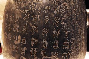 Zhang Shang trzyma zapis inskrypcji z Kamiennego Bebna,