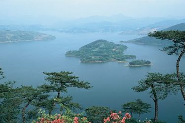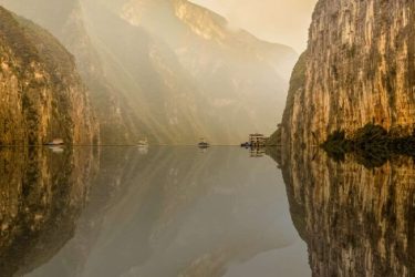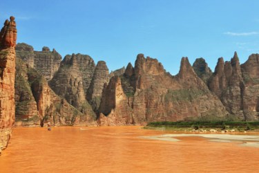 Żółta Rzeka daleko w górze pomiędzy białymi chmurami,